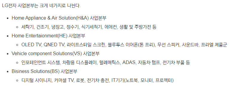 - H&A (Home Appliance & Air Solution) : 세탁기, 냉장고, 에어컨, 청소기 등 생활가전 제품을 개발 및 판매합니다. LG전자는 스마트 기술과 에너지 효율성을 강조하며, 고객의 삶의 질을 높이는 데 중점을 두고 있습니다.
