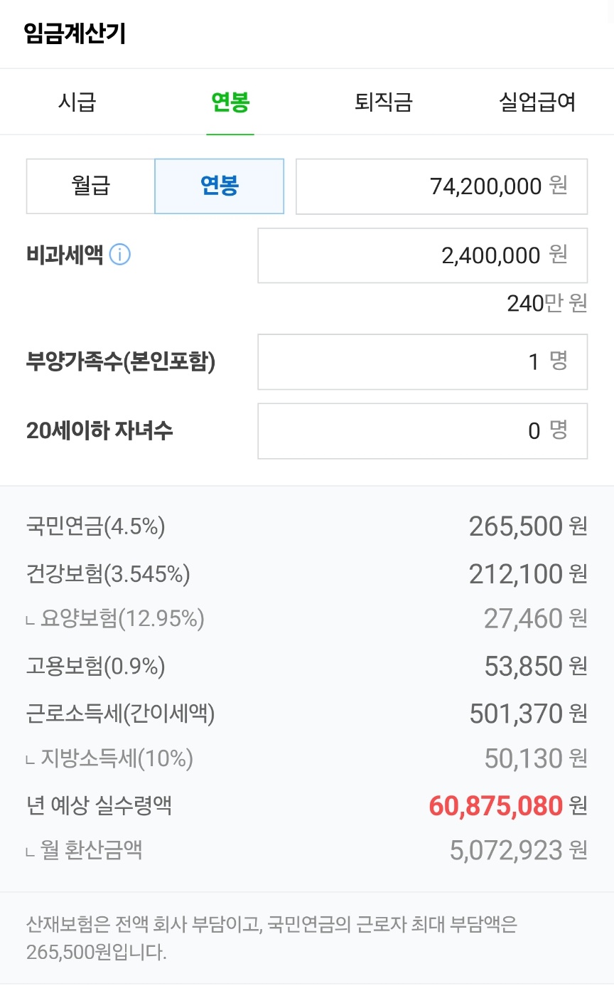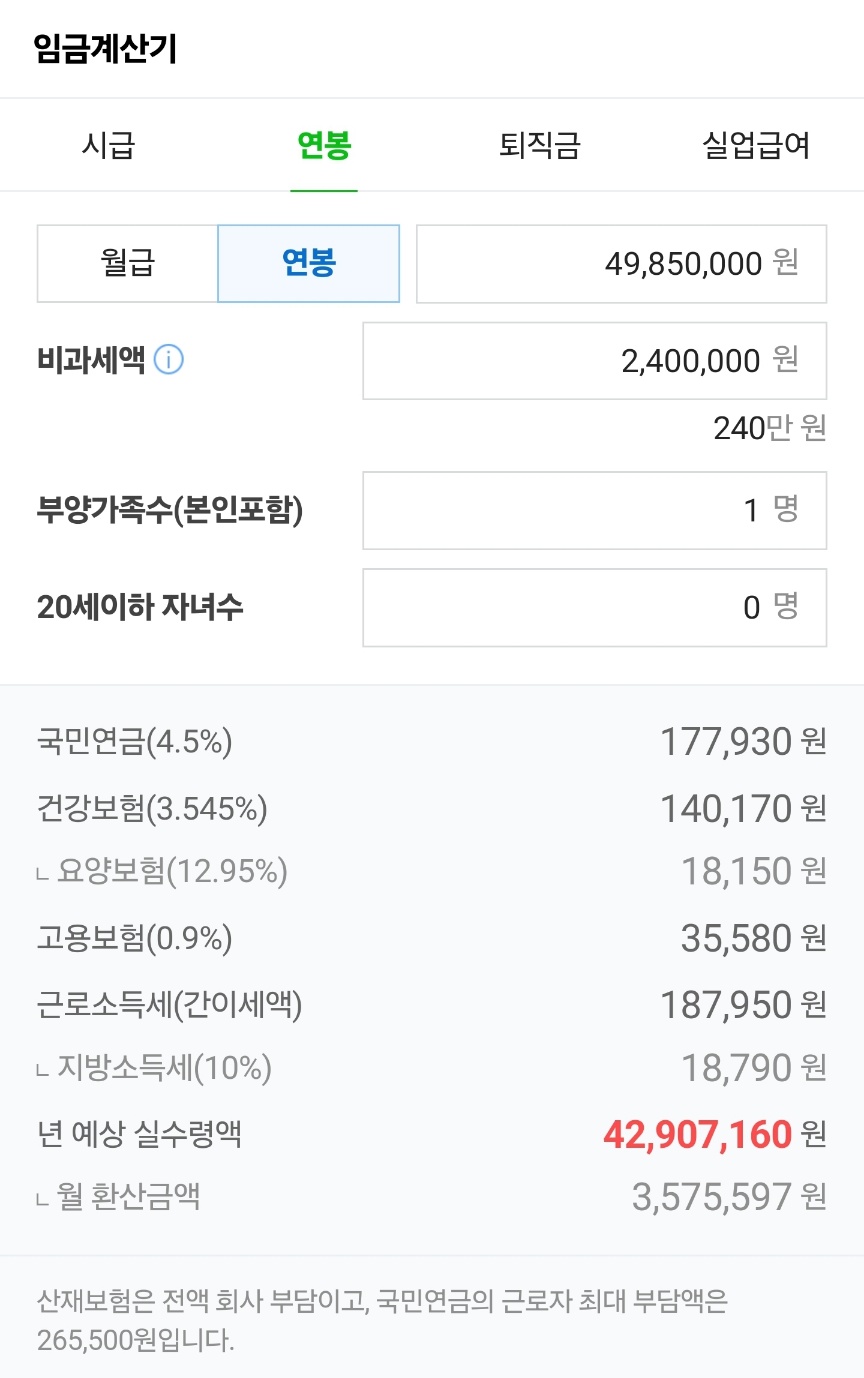 이를 아래 임금계산기를 통해 실수령액을 추정해보았을 떄, 약 4290만원 정도의 연봉을 실수령액으로 받았다고 할 수 있습니다.