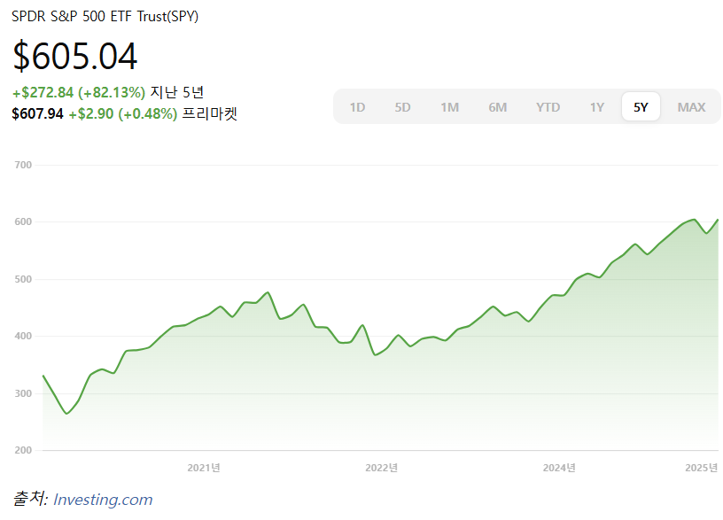 SPY는 미국 S&P 500 지수를 추종하는 ETF로, 미국 주식시장 전체를 대표하는 상품이다.