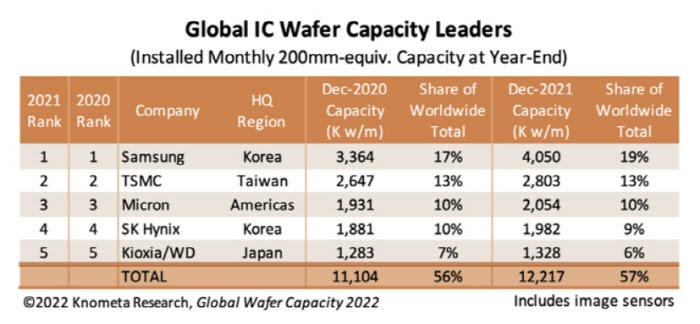 삼성전자가 지난해 반도체 웨이퍼 생산량에서 글로벌 왕좌를 차지했다. 월 400만장의 웨이퍼를 생산해 TSMC, 마이크론 등을 큰 차이로 따돌리고 1위를 지켰다.15일 미국 시장조사업체 노메타리서