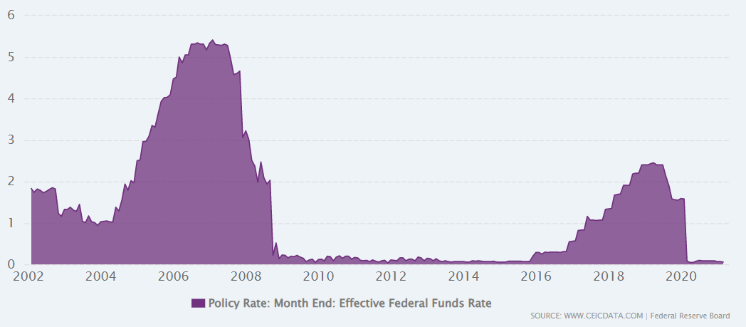 아래는 2002년부터 현재까지 약 20년 간의 미국 기준금리 변동 추이를 나타낸 그래프이니 참고하시기 바랍니다.