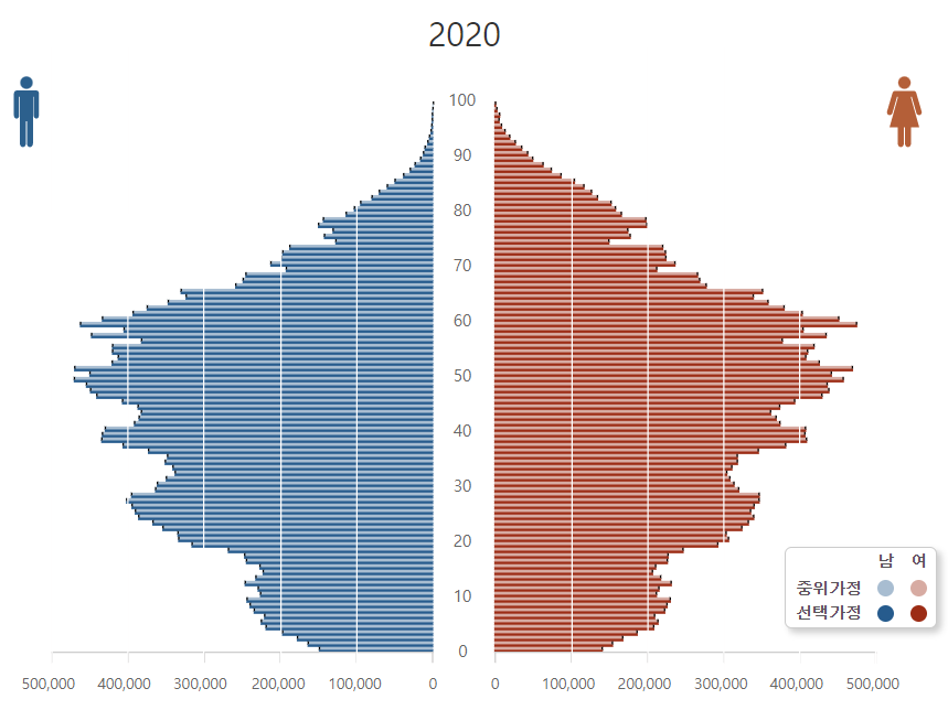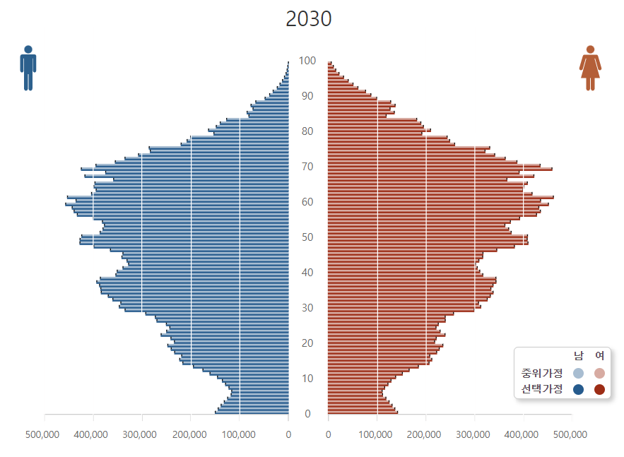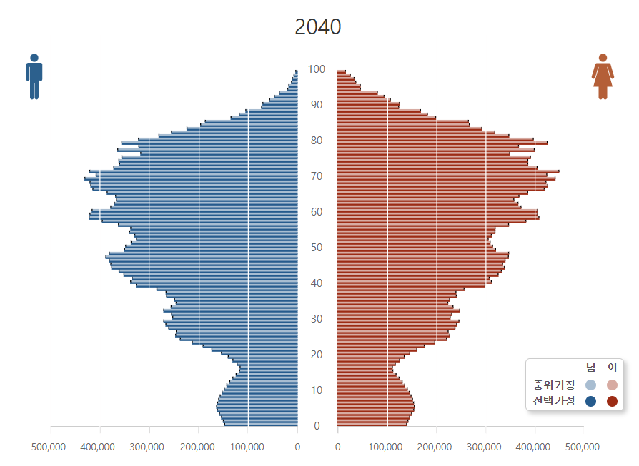 하지만 연령별 인구수의 추이를 보시면 고령화 문제가 매우 심각하다는 사실을 보실 수 있습니다.